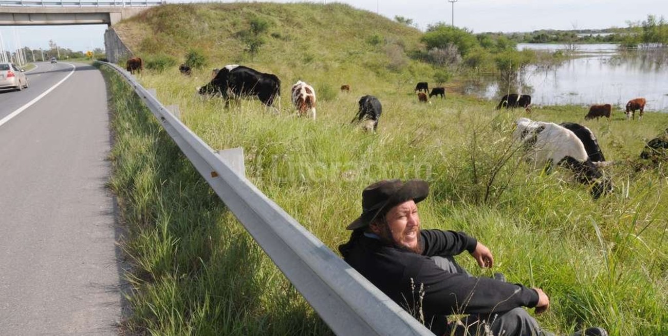 “Hoy traje 35 vacas. Pero cerca del puesto de Gendarmería (kilómetro 10) tengo más en un corral que armamos. Soy de Alto Verde y salí de la isla el 11 de diciembre. Desde entonces hago esto: cuatro veces al día saco las vacas del corral y, por el costado de la ruta, las traigo hasta acá (kilómetro 14). Tomo el puente de la colectora, a la altura del viejo atracadero de la balza para cruzarlas al otro lado. Ya se me murieron cinco caballos de hambre, no puedo perder las vacas. Pedí ayuda en el Ministerio de Agricultura y Ganadería pero me dijeron que sólo le dan a la gente que tiene tambo o campos para agricultura. A nosotros como estamos en la isla, que es zona de riesgo, no nos corresponde nada”.