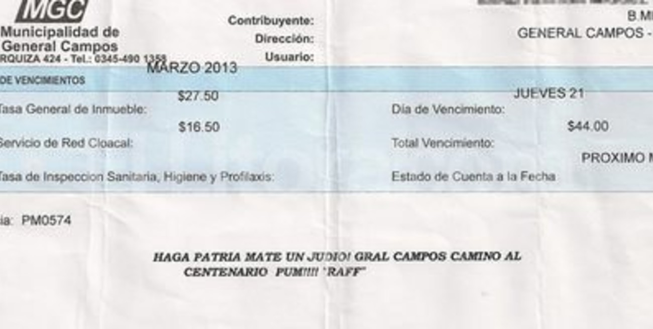 La jefa de Rentas de la municipalidad de General Campos, Marta Troche, admitió hoy ser la responsable de la aparición de leyendas antisemitas en una de las boletas de impuestos de ese municipio del noreste entrerriano.