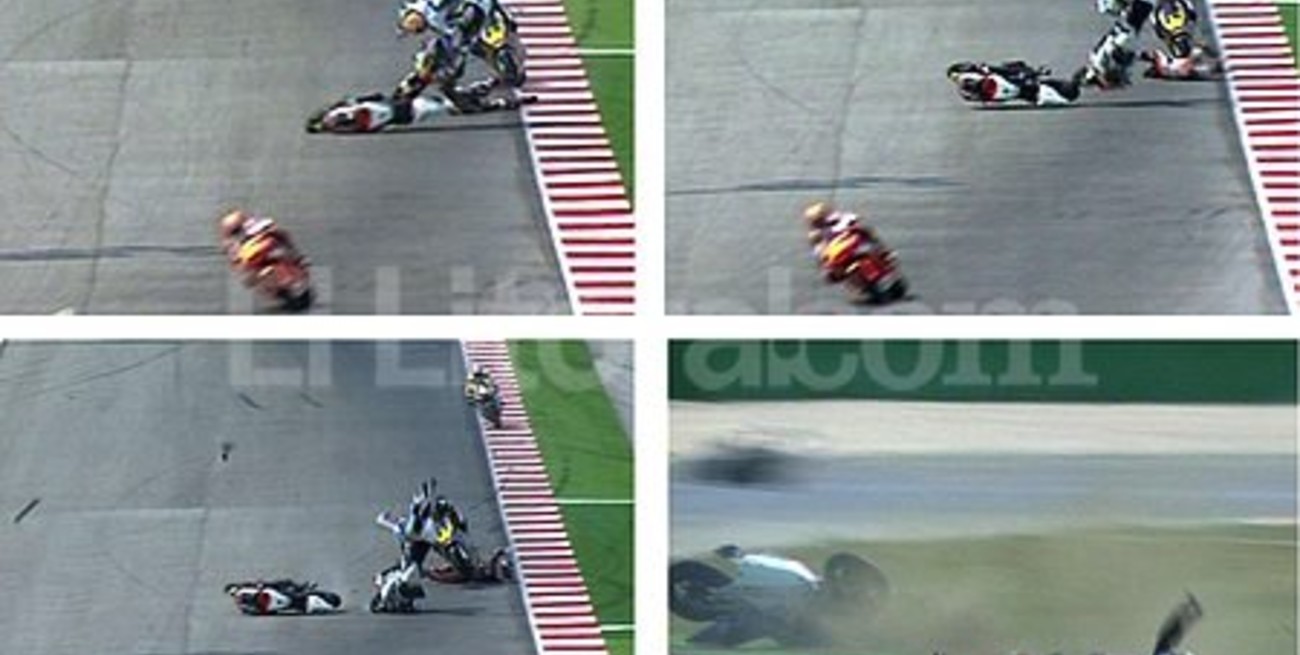 El piloto de 19 años sufrió una caída en la vuelta 12 de la carrera, cuando marchaba 4º, al resbalar su rueda delantera y fue atropellado por el británico Scott Redding y el sanmarinense Alex de Angelis, que iban justo detrás y no pudieron esquivarlo.