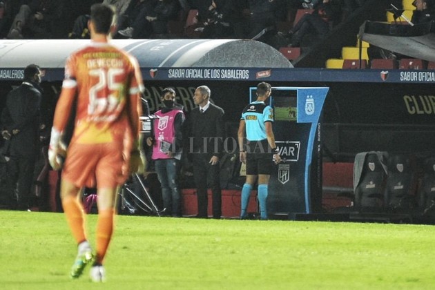 El árbitro Lamolina no había advertido una mano de Gian Nardelli, cuando perdió la estabilidad adentro de su propia área. Fue llamado para observar la jugada y cobró el penal con el que se abrió el marcador en el Brigadier López.