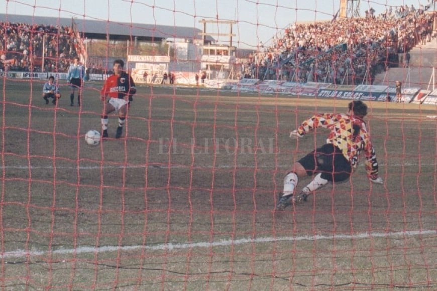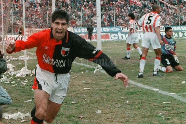 Archivo El Litoral Gambier en el festejo de uno de los dos goles en la final del ascenso de 1995.