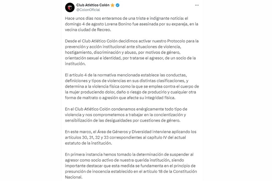 La institución informó que tomó la determinación de "suspender al agresor como socio activo de nuestra querida institución". Esta decisión -informaron- se enmarca en los artículos 30, 31, 32 y 33 del capítulo IV del estatuto del club, los cuales permiten acciones preventivas cuando se trata de situaciones de violencia de género.