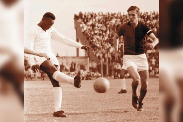 Alberto Poncio, al año siguiente, en 1964, marcando a Pelé. El Beto fue uno de los que defendió los colores de Colón en la C y jugó aquélla última vez en cancha de Barracas Central. Crédito: Archivo El Litoral