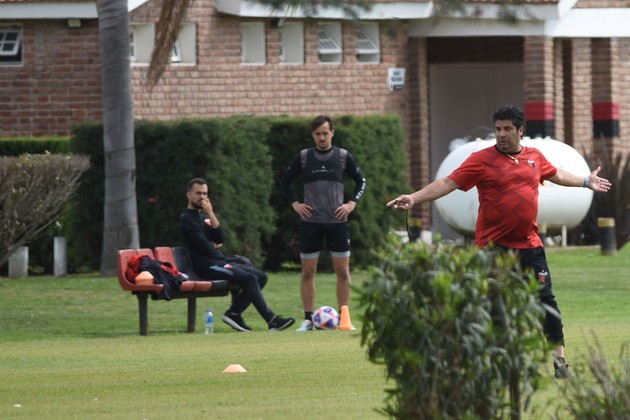 Marcelo Saralegui gesticula a la hora de dar sus primeras indicaciones. Dirigió la práctica del miércoles, la de este jueves por la mañana que fue liviana y se subió al micro con sus futbolistas para viajar a La Plata. Crédito: Mauricio Garín