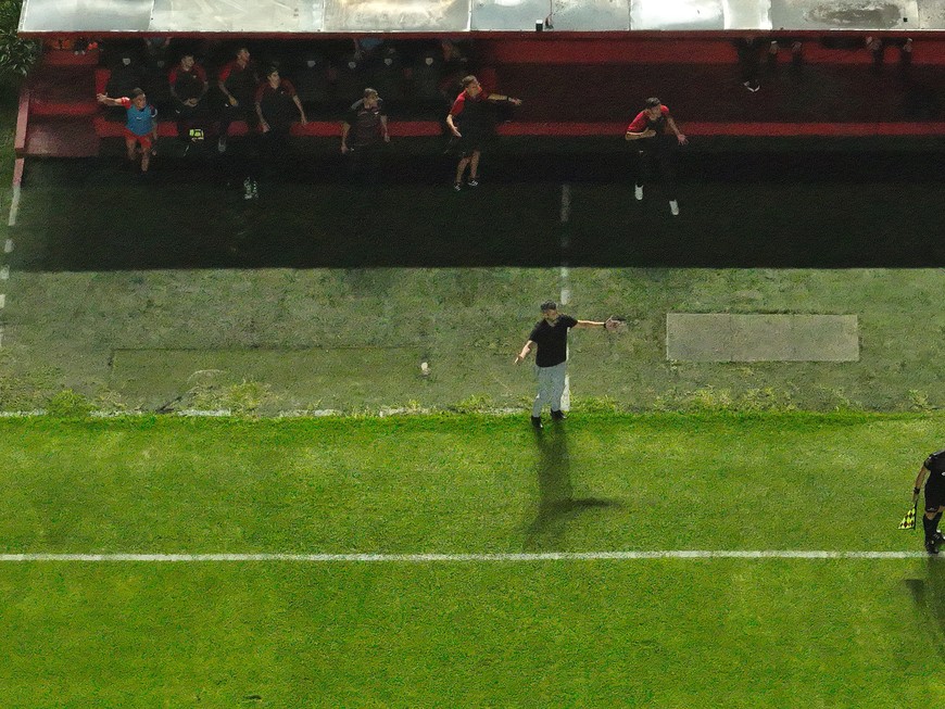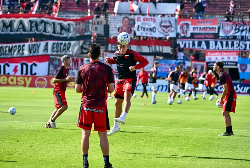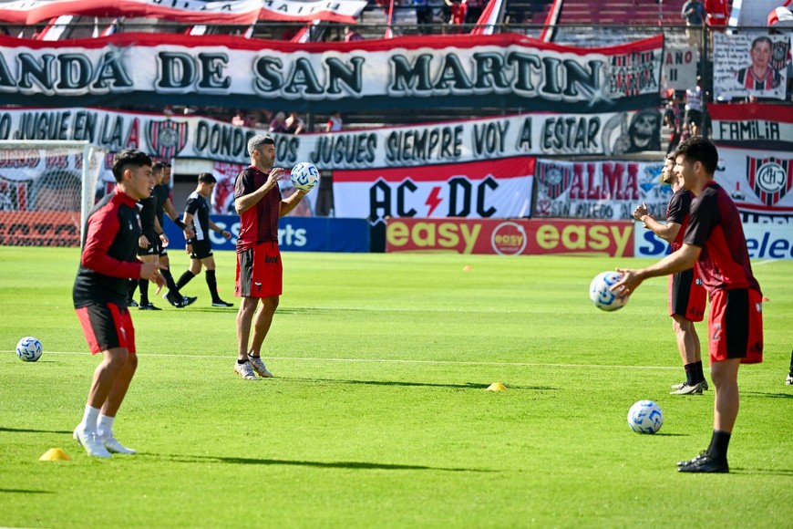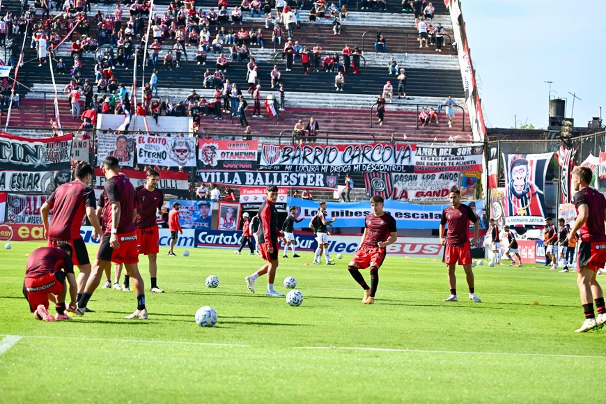 El conjunto rojinegro realiza la entrada en calor en la cancha, a minutos del partido. Fotos: Juan Manuel Foglia.