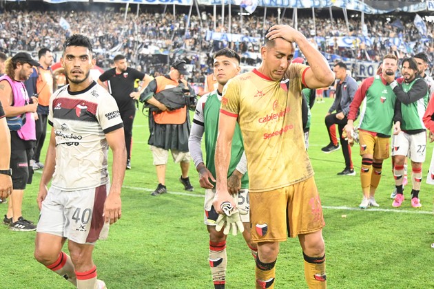 Una de las últimas imágenes de Colón en la máxima categoría, con los jugadores sabaleros (Delgado e Ibañez) apesadumbrados por la derrota y el descenso a la Primera Nacional. Crédito: Marcelo Manera