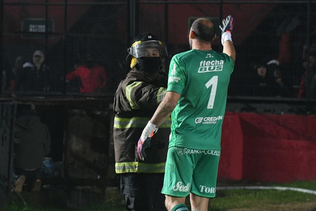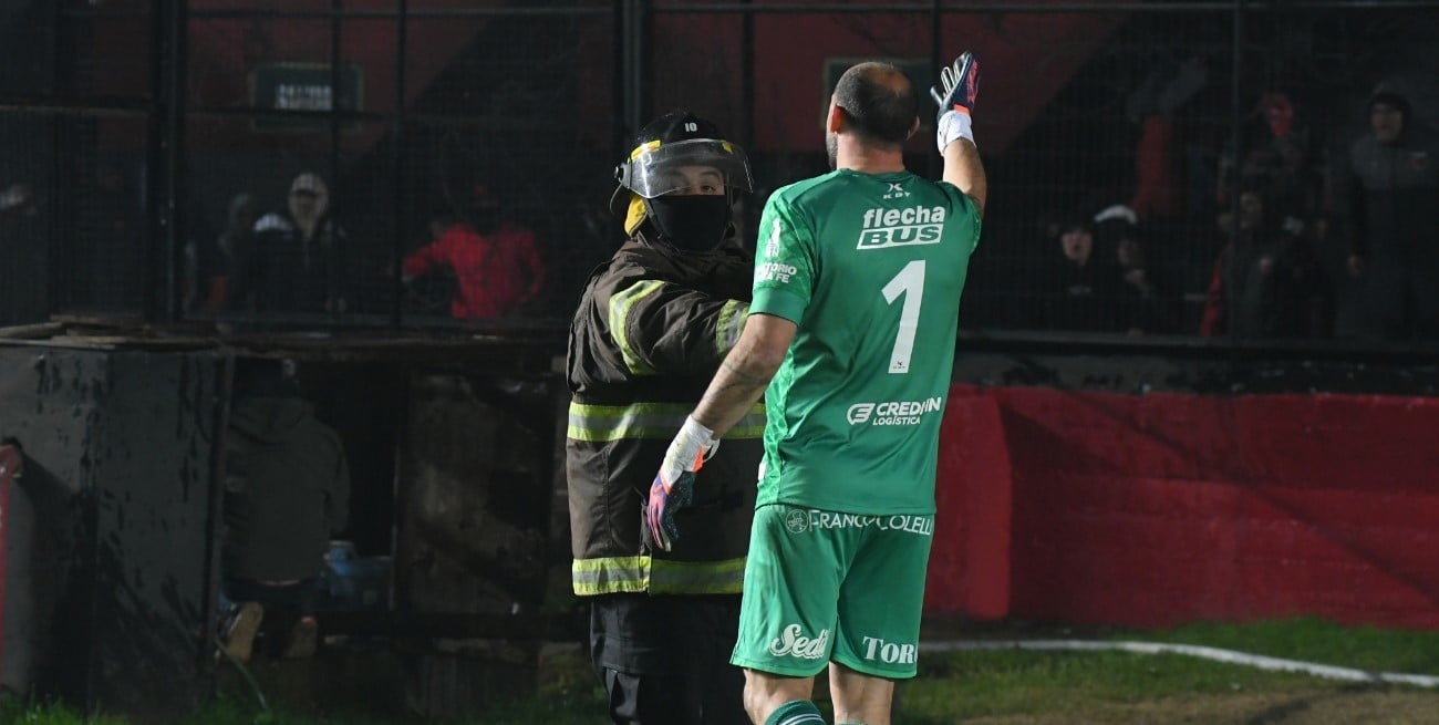 ¿Es agua o es humo?. La noche olvidable del partido con Mitre de Santiago del Estero que terminó con derrota y suspensión. Marcos Díaz, separado del resto, buscó "salvarse solo" enfrentando a los bomberos: lejos de apagar el fuego, el incendio fue mayor. A ese quiebre con el grupo no lo pudo atajar. Foto: Manuel Fabatía.