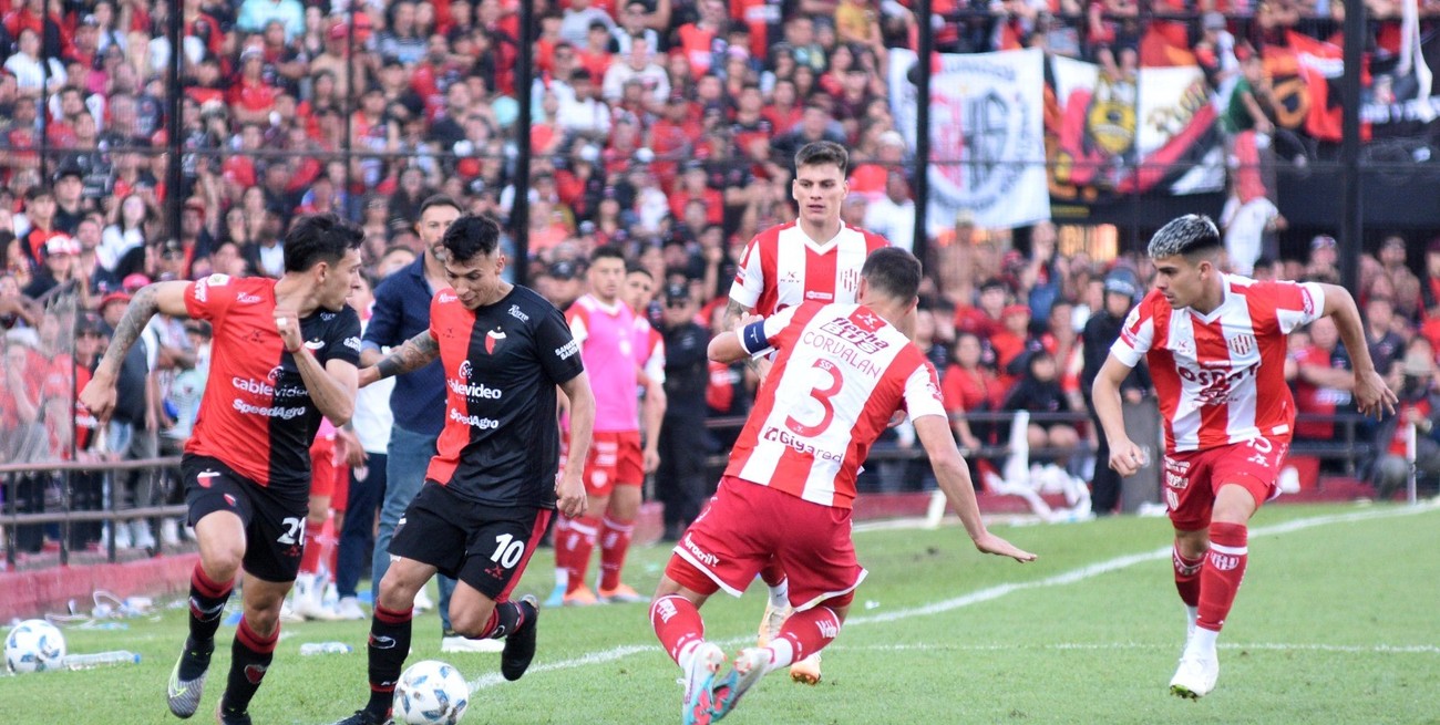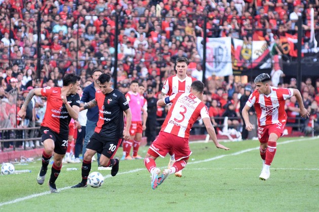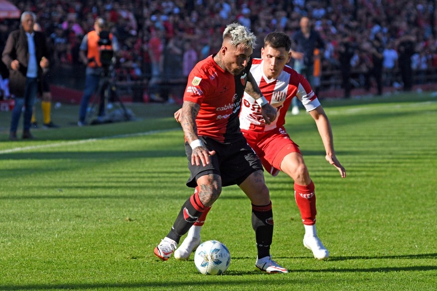 Botta se lleva la pelota y Meza le pasa por detrás ante la marca a presión, sobre la raya, de los jugadores de Unión. Uno está en duda (Botta) y el otro volvería al equipo (Meza) en reemplazo del desgarrado Espínola. Crédito: Pablo Aguirre.