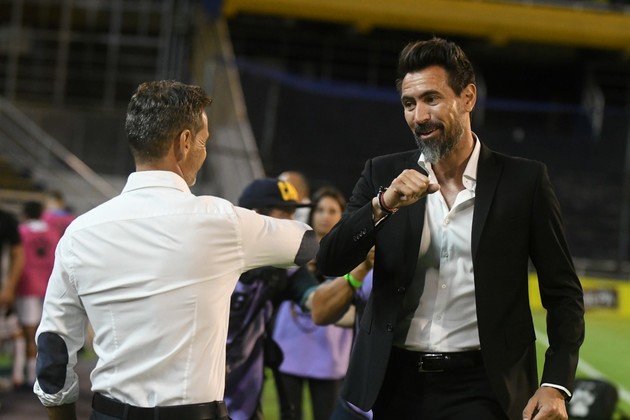Por protocolo Covid hubo saludo con los codos entre los entrenadores.