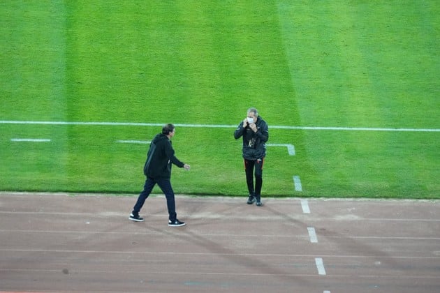 La dupla técnica. Julio César Falcioni y su ayudante, Omar Píccoli, en un instante del juego anoche en el Mario A. Kempes. Entre ambos decidieron que Novillo juegue de lateral izquierdo; según el DT sabalero, el defensor cumplió con las expectativas... Crédito: Fernando Nicola
