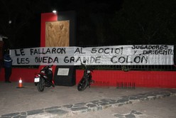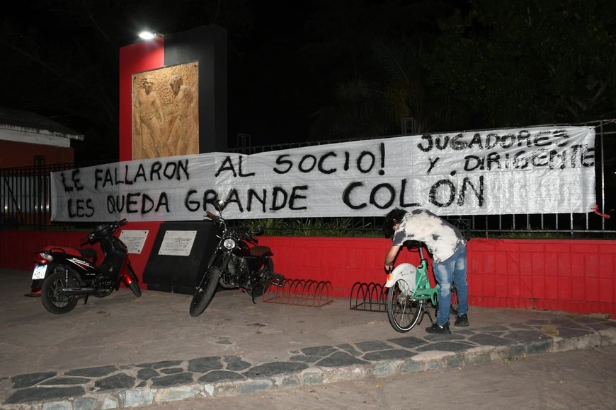 La bandera de la queja. En la misma sede social sabalera, además de auto-convocarse, los hinchas y socios sabaleros dejaron colgada una bandera con un mensaje más que claro en medio de la crisis que vive Colón. Fotos: Manuel Fabatía