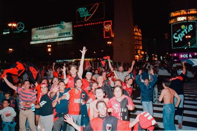 Con el correr de los minutos el histórico Obelisco porteño se plagó de camisetas rojinegras. Al poco tiempo también detuvo su marcha el colectivo de los jugadores y compartieron la fiesta con los simpatizantes.