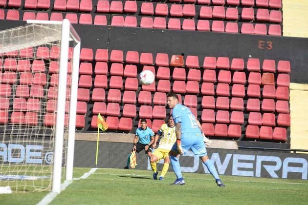 Federico Lértora conecta, en posición adelantada y mitad con la cabeza y otra mitad con la mano, un centro del Pulga Rodríguez en el final del partido. Luego del amontonamiento de jugadores y de un rebote en Broun, la pelota se elevó y Leguizamón convirtió, pero ya estaba todo invalidado. Foto: Manuel Fabatía