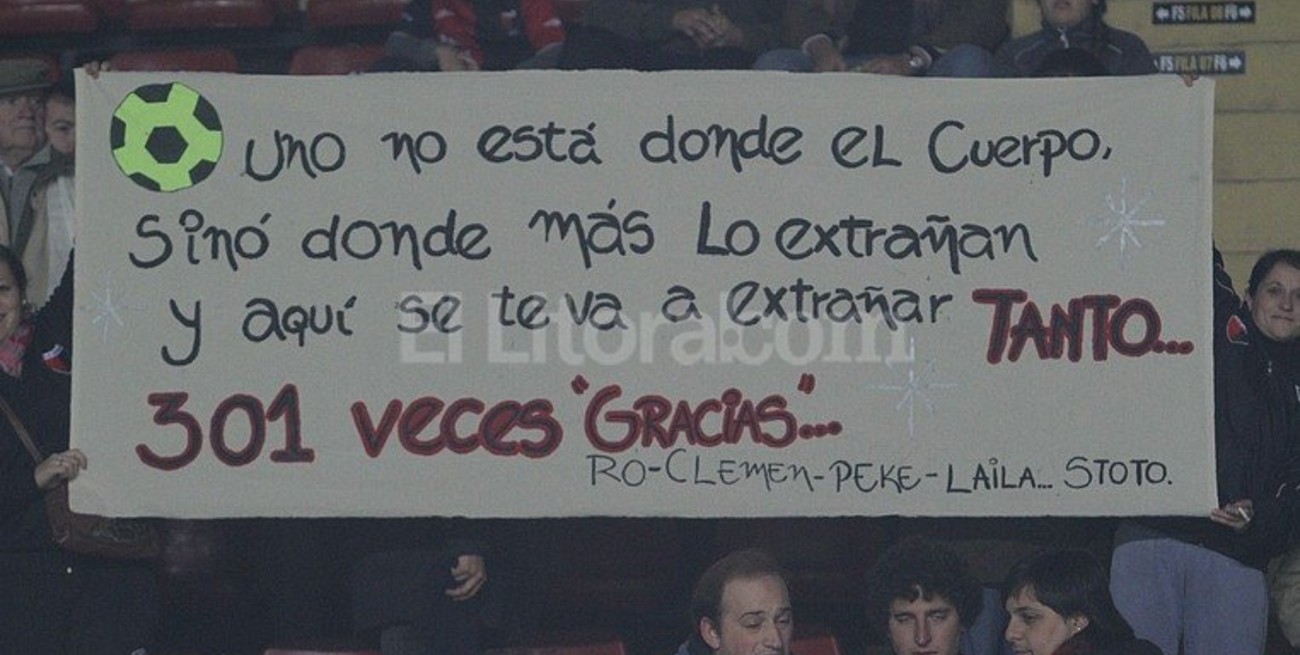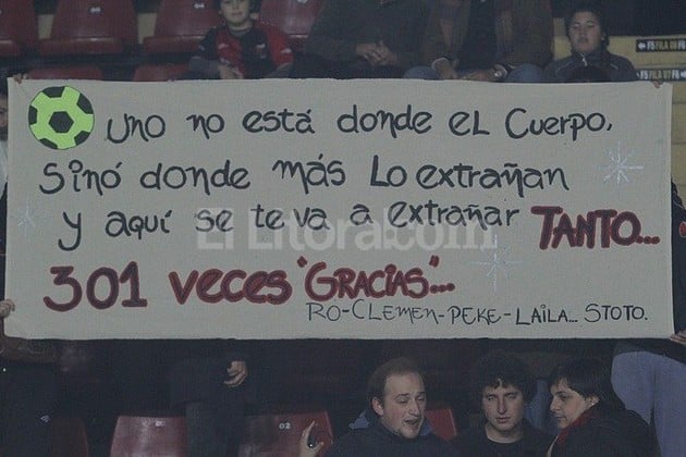 Otro de los trapos ubicados en el sector central de la platea oeste, hecho en entretela y dibujado con colores rojos y negros, tenía en un vértice el escudo de Colón y en el otro el número 20. “Hiciste historia y yo te ví. Gracias eternamente ídolo”. Betiana y Julieta se vinieron desde San Jerónimo Norte con la pancarta y la exhibían orgullosas a los demás plateístas.