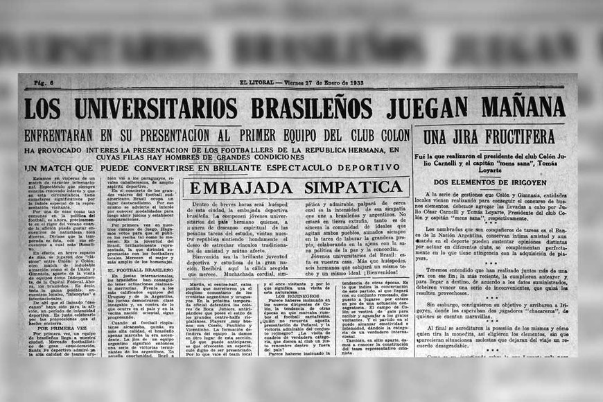 La historia que se cuenta a continuación sucedió un día como hoy hace 90 años, en la etapa amateur del club, cuando militaba en lo que actualmente es la Liga Santafesina. Colón junto a Unión y Gimnasia eran los pesos pesados del fútbol local. Con cuatro partidos internacionales como antecedente, el sabalero recibió en su antiguo estadio a “Universitarios brasileños”, un combinado de estudiantes del vecino país que anduvo de gira por Argentina en el verano de 1933 y llegó a Santa Fe para medirse con el “negro” y el “mens sana”.