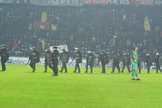 Ahí, explotó todo. La mayoría de la gente con cánticos contra todos y apuntando a la Comisión Directiva; el sector más ruidoso, el de la barra brava, tumbó un portón, rompió el alambrado bajo y volaron cientos de proyectiles en la cabecera norte: ladrillos, palos y hasta botellas. Los bomberos intentaron frenar con agua helada y fue peor.