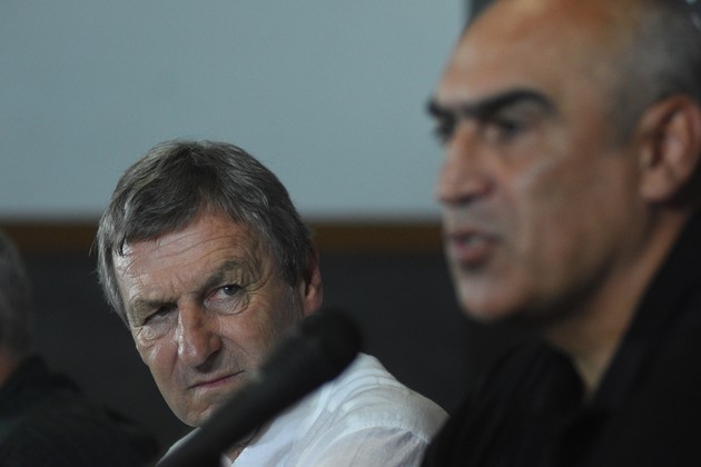 El "Bicho" Godano escucha atentamente a Iván Delfino, con el que jugó al fútbol en Rafaela cuando Delfino arrancaba y ya el "Bicho" daba sus últimos pasos como jugador, después de haberse desempeñado en Colón, como profesional, durante más de una década. Foto: Pablo Aguirre.