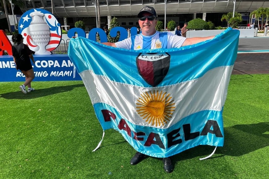 “Vinimos para la Copa América junto con mi señora y mi hija. Estuvimos una semana en Estados Unidos y ya nos estamos volviendo a Rafaela porque hay que volver a trabajar”, cuenta Gustavo al enviado de El Litoral, en las adyacencias del Hard Rock de Miami, mientras esperaba el turno para sacarse una foto con el logo, paso ineludible para todos los que concurren a los estadios, como ya ha ocurrido en Atlanta y en New Jersey.