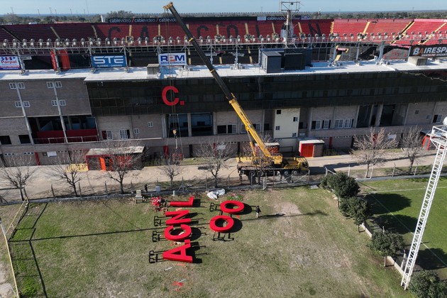 Las letras ya están listas y una gran grúa las coloca cuidadosamente para que luzcan impolutas en la cancha.