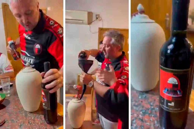 A través de las redes sociales se viralizó cómo este santafesino abría con un taladro el recipiente y luego, con un embudo, introducía algunas gotas de vino tinto. La bebida también tenía un valor especial, fue la botella que el equipo de barrio Centenario comercializó para los 100 años del club.