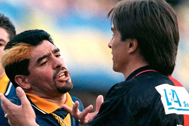 La roja para Toresani, Maradona pegado al referí.