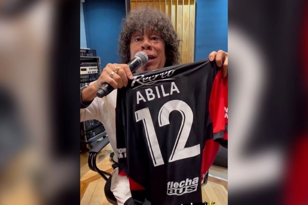 Ramón Wanchope Ábila le regaló la camiseta de Colón al músico cuartetero Carlos "La Mona" Jiménez.
