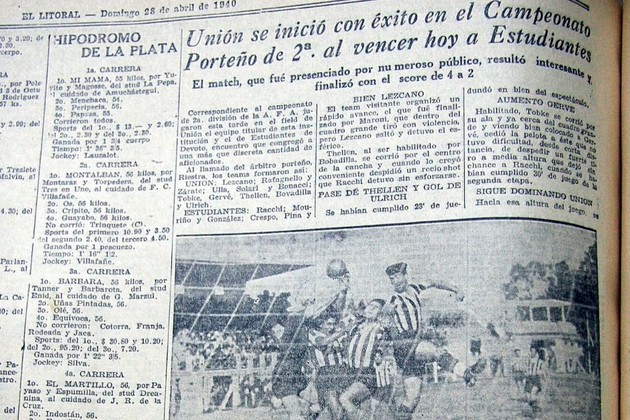 Archivo El Litoral La cobertura de El Litoral ese mismo día en que se jugó el primer partido de Afa en Santa Fe. Unión ganó las tres primeras fechas y perdió en la cuarta con Argentinos Juniors. Estaba en pleno auge la Segunda Guerra Mundial.Archivo El Litoral La cobertura de El Litoral ese mismo día en que se jugó el primer partido de Afa en Santa Fe. Unión ganó las tres primeras fechas y perdió en la cuarta con Argentinos Juniors. Estaba en pleno auge la Segunda Guerra Mundial.