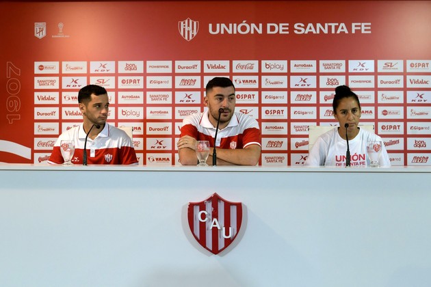 Presentación en rojo y blanco. En el centro de la imagen, Paulo Poccia, DT del equipo, acompañado por Mara Domínguez, jugadora del plantel y Martino Petitti, preparador físico. En la mañana de este miércoles se hizo la presentación oficial del plantel que pone en marcha el torneo de ascenso de AFA. Crédito: Guillermo Di Salvatore