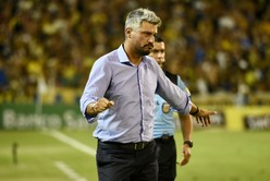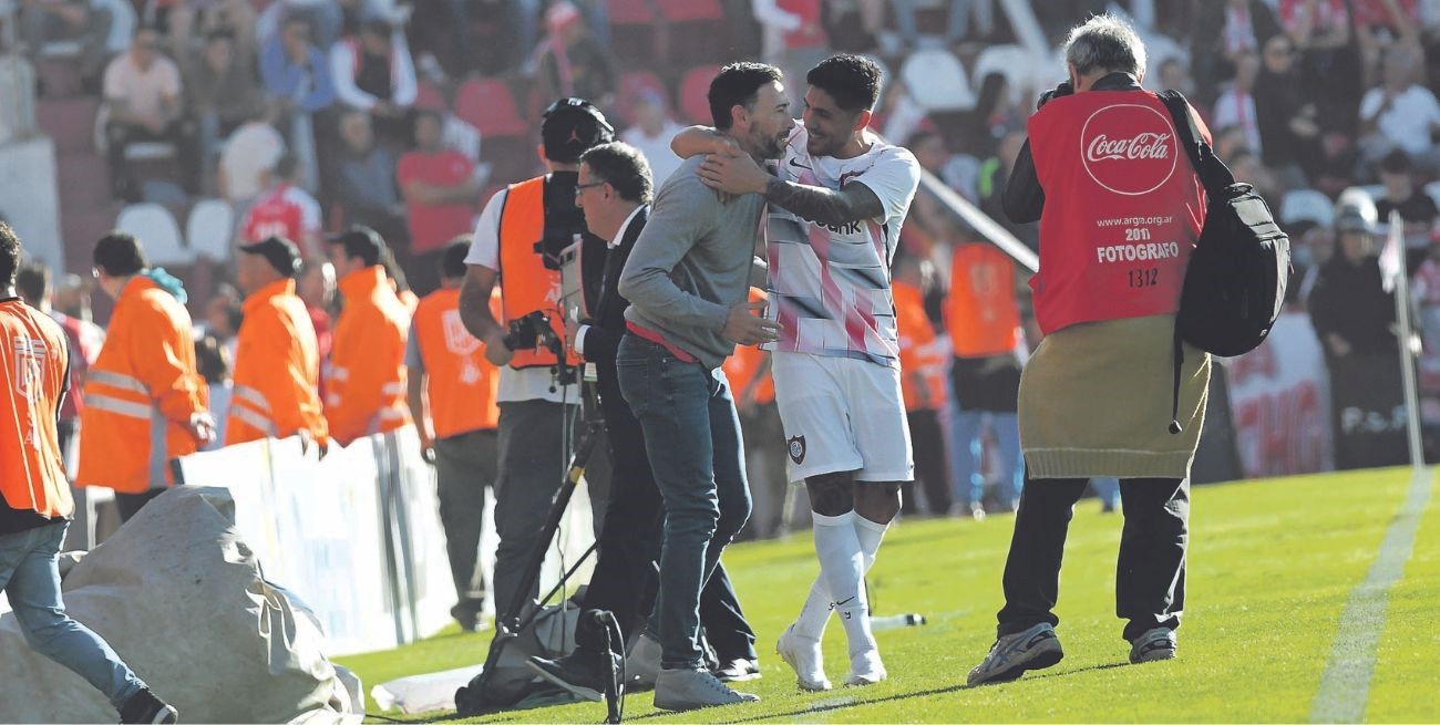 Cristian González se saluda con Tarragona, el delantero de San Lorenzo. El DT tatengue logró desvirtuar prejuicios y sombras con un excelente comienzo de campeonato, de lo mejor en la historia de Unión en Primera. Crédito: Mauricio Garín.