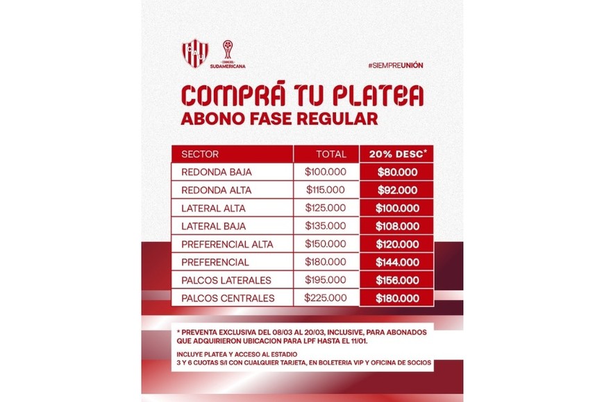 Los hinchas de Unión de Santa Fe ya pueden asegurarse su lugar en la fase de grupos de la Copa Conmebol Sudamericana. La preventa exclusiva de plateas para los socios plateístas que adquirieron su ubicación en el torneo local hasta el 11 de enero ya está en marcha, con un 20% de descuento.