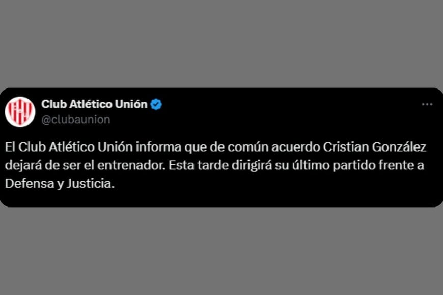 “El Club Atlético Unión informa que de común acuerdo Cristian González dejará de ser el entrenador. Esta tarde dirigirá su último partido frente a Defensa y Justicia”, expresa el texto oficial.