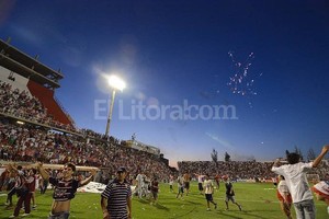 En un improvisado balcón los futbolistas festejaron con los hinchas el regreso a Primera división