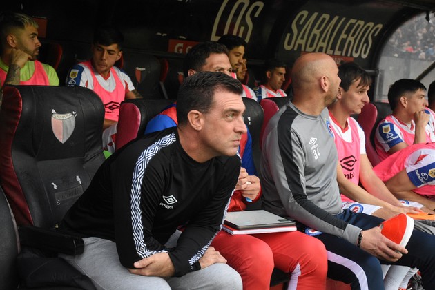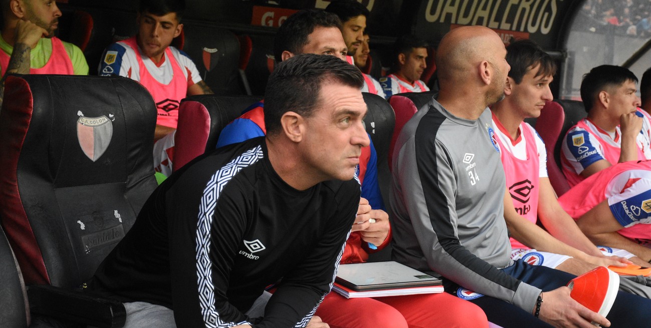 Con la soga al cuello. Pablo Guede, sentado en el banco de Argentinos Juniors el año pasado en la cancha de Colón. Las eliminaciones coperas (Sudamericana y Argentina) y la mala campaña en la Liga Profesional lo traen el lunes al borde del nocaut. Crédito: Pablo Aguirre