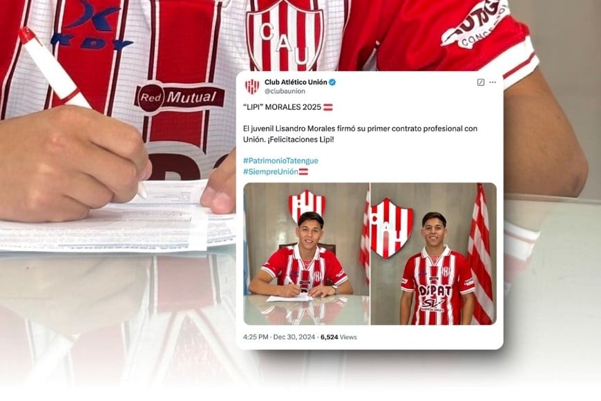 "LIPI MORALES 2025. El juvenil Lisandro Morales firmó su primer contrato profesional con Unión. ¡Felicitaciones Lipi!", publicó el club en sus redes sociales, acompañado de fotos del futbolista firmando el acuerdo.