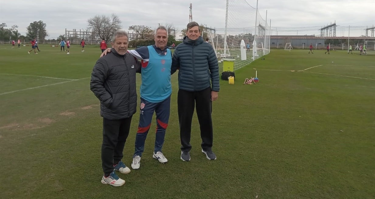 Leo Madelón en Casasol junto a Hilario Bravi y el Patón Rossi, dos ex jugadores de Unión que fueron a saludarlo y vieron el entrenamiento.