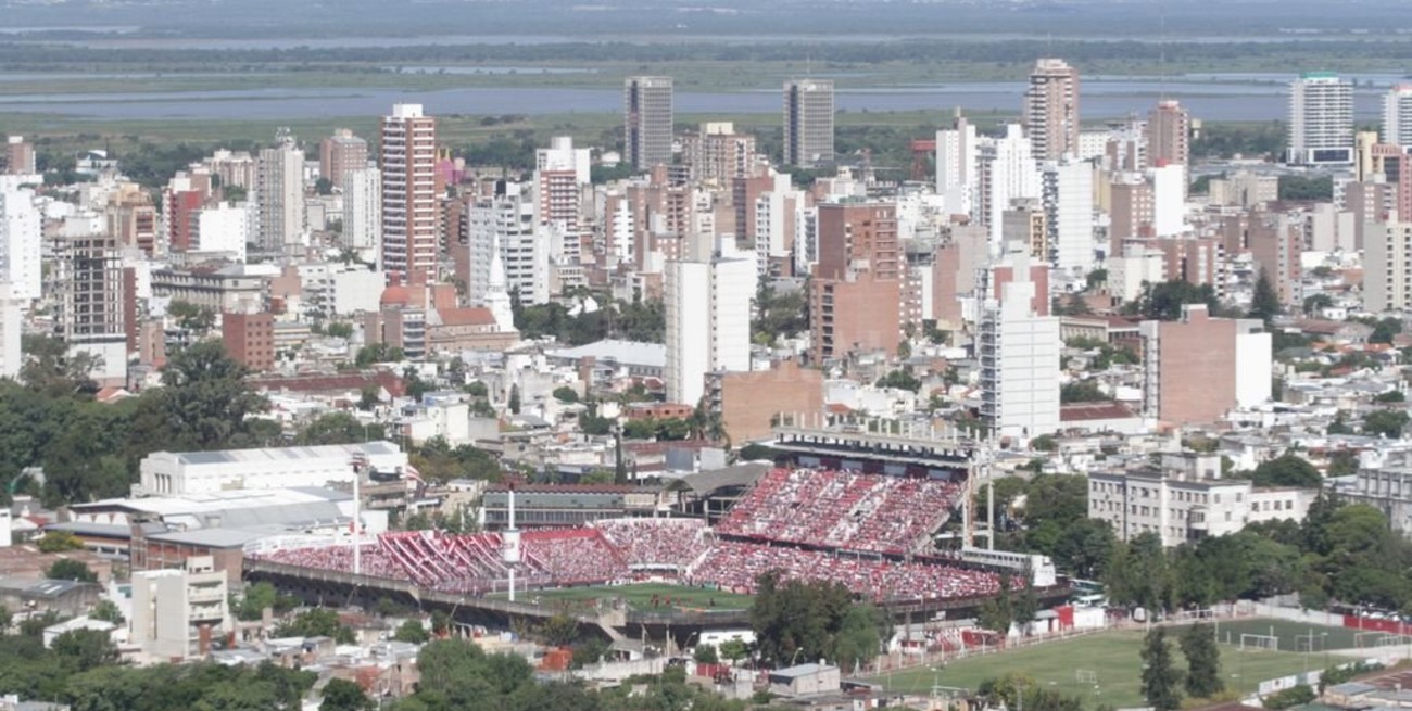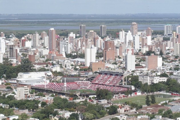 Pablo Aguirre Unión, la ciudad. Una vista aérea de El Litoral, con el fotógrafo ubicado en uno de los helicópteros de la provincia de Santa Fe. Se empieza a cerrar toda la bandeja sur del estadio 15 de Abril.