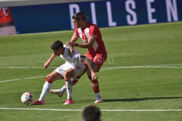 Luis Cetraro Apaolaza defiende bien la pelota ante la marca de Dylan Gissi, que debutó como titular pero que no anduvo bien. Reconoció, después del partido, que el cabezazo del segundo gol (el de Del Prete) se podría haber evitado.