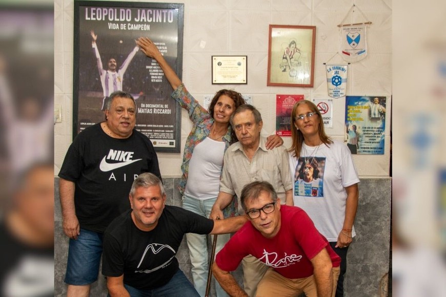 José Chaparro, presidente del club Mayoraz, junto a las hermanas de Leopoldo, Carlos Rojas (fundador de Guadalupe Juniors y amigo de la infancia de Luque) y los periodistas Adrián Brodski e Ignacio Pettinari. Créditos: Santiago Bilotta