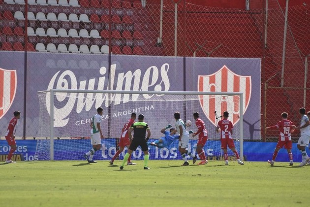 Entre Portillo y Calderón tocaron y demoraron la salida ante la pasividad de los atacantes visitantes que no presionaban, Calderón la quiso "revolear" pero pifió y la metió al medio, Portillo cabeceó y no hizo más que dejársela servida a Álvarez, que sacó un fuerte remate que se fue cerca del primer palo de Moyano. Desde una falla se terminó generando una situación de peligro para el arco de Sebastián Moyano.
