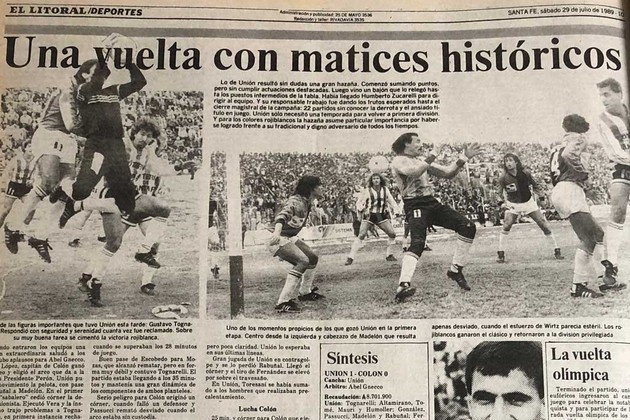 “La historia se repite” puso en su tapa Diario El Litoral el 29 de Julio de 1989 al hacer referencia al triunfo de Unión sobre Colón con el histórico gol de Leo Madelón.