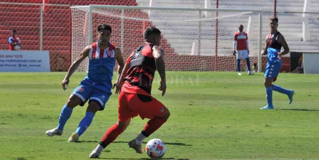 Gentileza Prensa Club Unión Acevedo volvió a pisar el 15 de Abril y jugó para los suplentes. En la foto, marca a uno de los volantes de Patronato, en tanto que se observa a Franco Calderón y, más atrás, a Ignacio Arce, quien retornó a la institución.