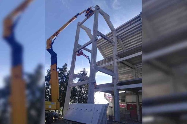 "Las imponentes columnas que le dará vida a la tribuna de Unión llegaron mucho antes de lo pensado: son seis en total y por ahora llegaron tres. Ahí, como se observa en la foto, estamos a 26 metros pero falta otra columna que va arriba hasta los 32.60 metros", confirmó el Arquitecto Hugo Panarisi, que es el "Jefe de Obra" designado por la empresa cordobesa Astori que fue contratada por el Club Atlético Unión.