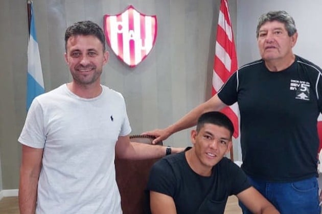 Cuando llegó al Tate. La firma de Diego Armando Díaz, junto a su repre y descubridor, en la sede tatengue. Foto: El Litoral.