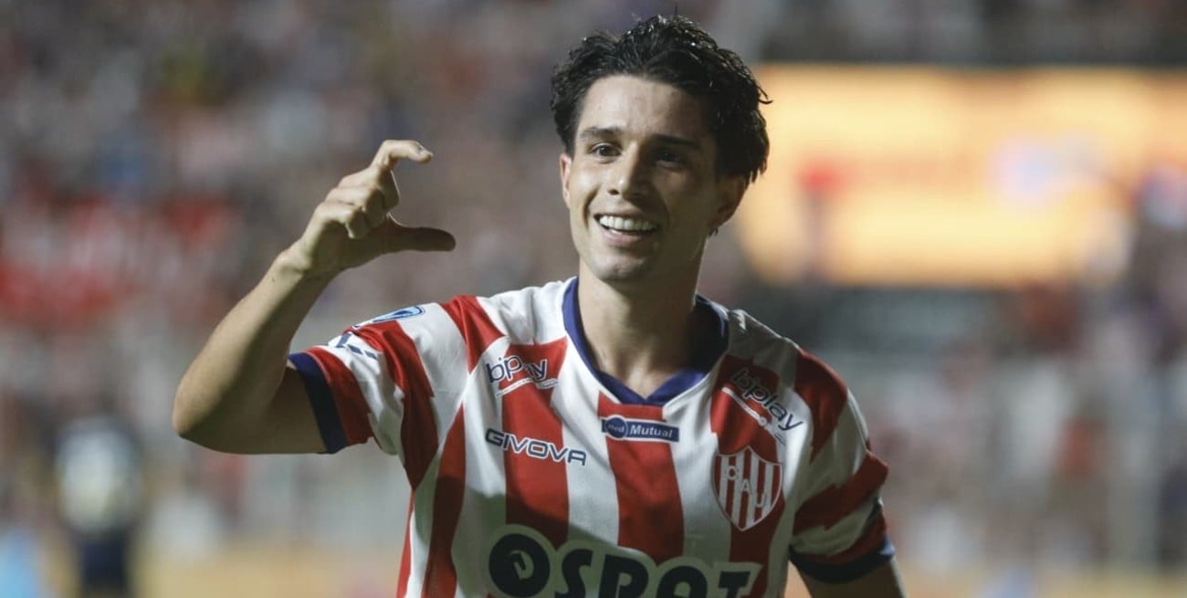 Julián Palacios y el festejo de su gol ante Boca. Otra vez, el volante hizo un buen partido y está pasando por su mejor momento en el club. Foto: Matías Pintos