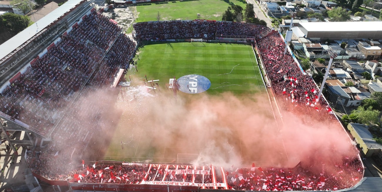 Imponente vista aérea del estadio 15 de Abril mientras se disputaba el partido del sábado. Hubo un lleno total, un recibimiento extraordinario al equipo y un festejo con invasión incluida al campo de juego. Crédito: Fernando Nicola