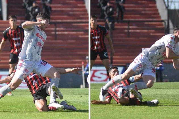 Esta fue la jugada más clara que tuvo Unión. Las dos fotos muestran el momento en el que Nardoni es derribado adentro del área cuando iban apenas 12 minutos del partido. Arasa no lo vio, pero el VAR lo llamó. Crédito: Pablo Aguirre
