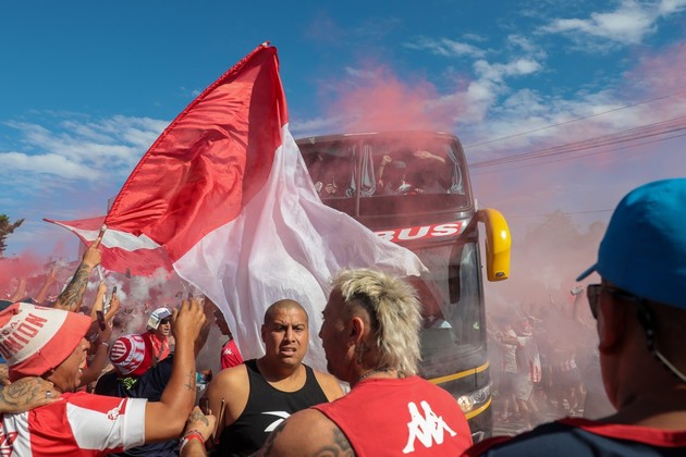 El aliento fue muy emotivo, los jugadores se sumaron y la gran mayoría, al margen de gritar arriba del colectivo, registraron el momento con sus celulares. El micro pasó a bajísima velocidad, casi a paso de hombre, para doblar por bulevar y meterse en el estadio.