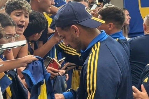 Leandro Paredes firma camisetas y autógrafos en la puerta del Hotel Los Silos, a la llegada de Boca a Santa Fe.
