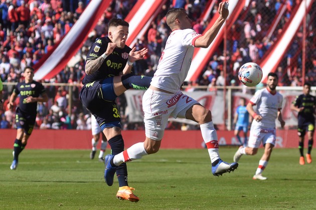 Franco Troyansky tuvo que "bailar con la más fea" enfrentando a los duros centrales de Huracán. Jugó mucho de espaldas al arco y no tuvo opciones claras. Crédito: Pablo Aguirre