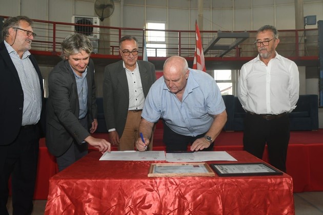 El momento de la firma del presidente de Unión, Luis Spahn, de la creación de la Academia de Ciencias del Deporte. Observan Amílcar Cecotti, Diego Sales, Jorge Tissera y Ricardo Dupuy.